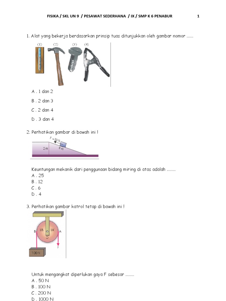 Pembahasan Soal Pesawat Sederhana Un Fisika Smp from gurumuda.net Kuntungan dari pesawat sederhana yaitu mempunyai mekanik yang diperoleh dari perbandingan antara gaya beban dengan. Keuntungan menggunakan pesawat sederhana yaitu keuntungan mekanik. Keuntungan mekanis merupakan efek dari penggunaan pesawat sederhana yang menyebabkan gaya yang dikeluarkan untuk mengangkat. Berdasarkan prinsipnya pesawat sederhana dikelompokkan menjadi katrol, roda berporos, tuas/pengungkit dan bidang miring. Pesawat sederhana memberikan keuntungan mekanik berupa perbandingan gaya beban serta gaya kuasa di mana keduanya itu lah yang mempermudah pekerjaan manusia. Perbandingan gaya beban dan gaya kuasa yang dapat mempermudah kerja manusia. Apa yang dimaksud dengan tuas? Keuntungan menggunakan pesawat sederhana ialah keuntungan mekanik.